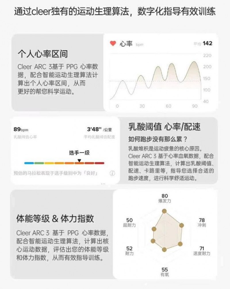 Cleer and GoMore also jointly equipped the ARC 3 Sound Arc Sport Pro with a series of exercise physiology algorithms, including personalized heart rate ranges, key aerobic indicators, energy consumption, training analysis, real-time status, and advanced running indicators. In the Cleer+app backend, users can experience precise physical fitness assessment, training effect analysis, and physical fitness estimation based on changes in heart rate and blood oxygen data. These indicator functions not only help accurately evaluate running ability, but also monitor training effectiveness in real time, providing strong support for users to develop more scientific and reasonable training plans.