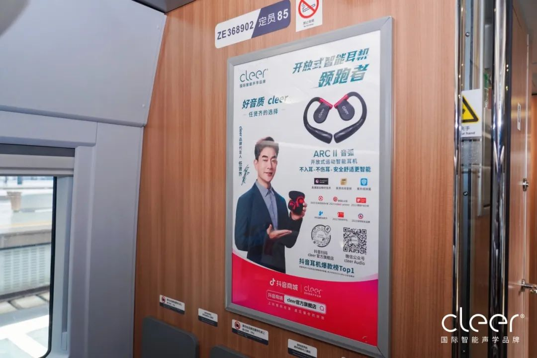 走進Cleer耳機高鐵專列,旅客可以看到專為品牌構(gòu)建起的全方位立體化傳播空間。外車身貼,是穿梭在全國各地高鐵站中最靚麗的品牌風(fēng)景線;頭枕巾、小桌板、品牌長廊、列車海報,重復(fù)性視線吸引,不斷深化品牌形象。加上高鐵乘客的巨大流動性,勢必會為高鐵車廂內(nèi)的Cleer品牌宣傳帶來更廣闊的影響力。